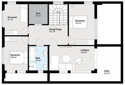 Boligen har et komfortabelt soverom, bad og sportsbod/vaskerom i første etasje, samt en åpen stue- og kjøkkenløsning med direkte utgang til en solrik terrasse. I andre etasje finner du tre soverom, et bad, en bod og en ekstra stue med utgang til altan.